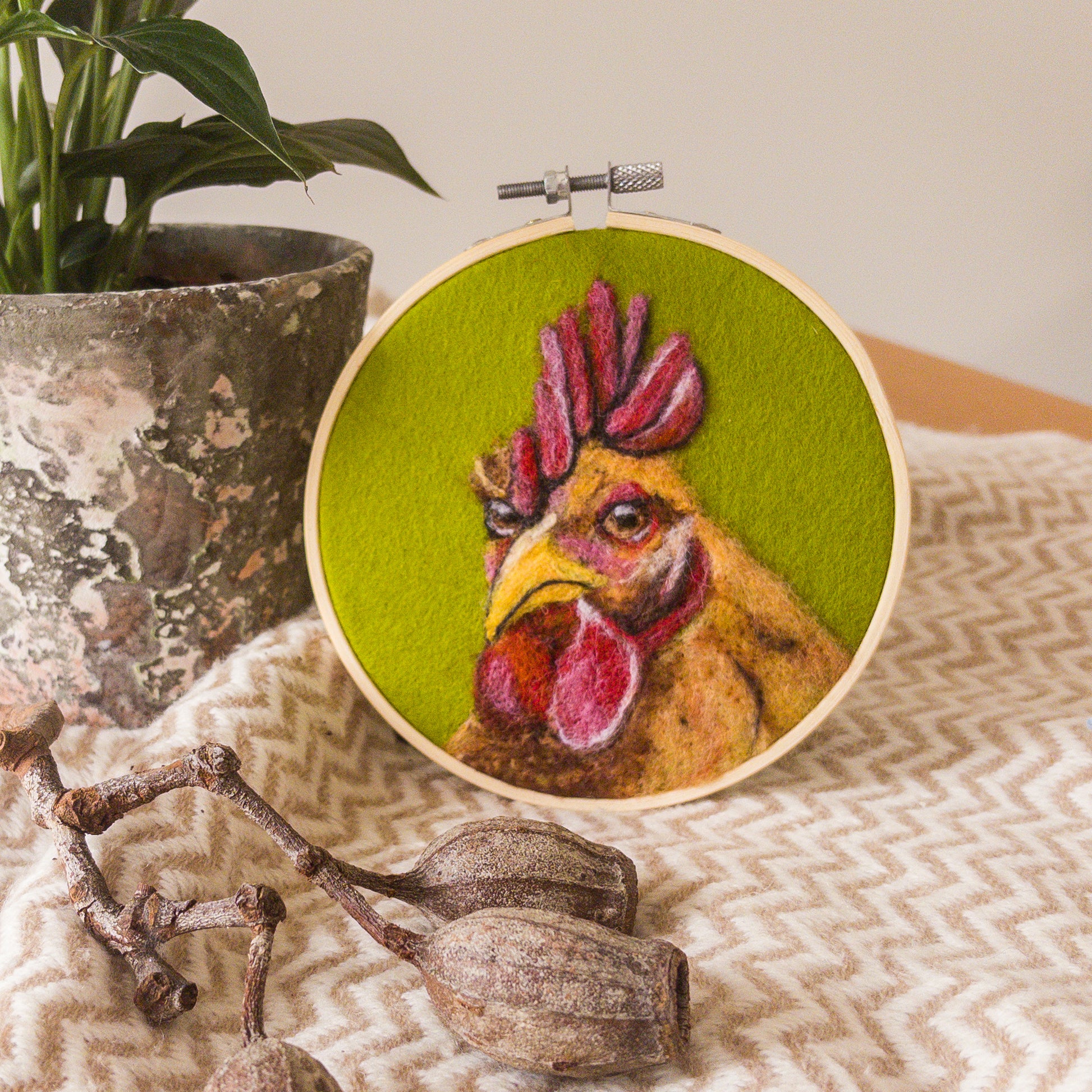 Bring a touch of countryside charm into your home with this little handmade felted portrait of a rooster. Carefully crafted from soft, natural wool, the rooster comes to life with rich textures and vibrant tones that highlight its proud stance and spirited character. Nestled inside a classic wooden embroidery hoop, this piece is ready to hang or display on a shelf, adding a rustic yet whimsical accent to any room.